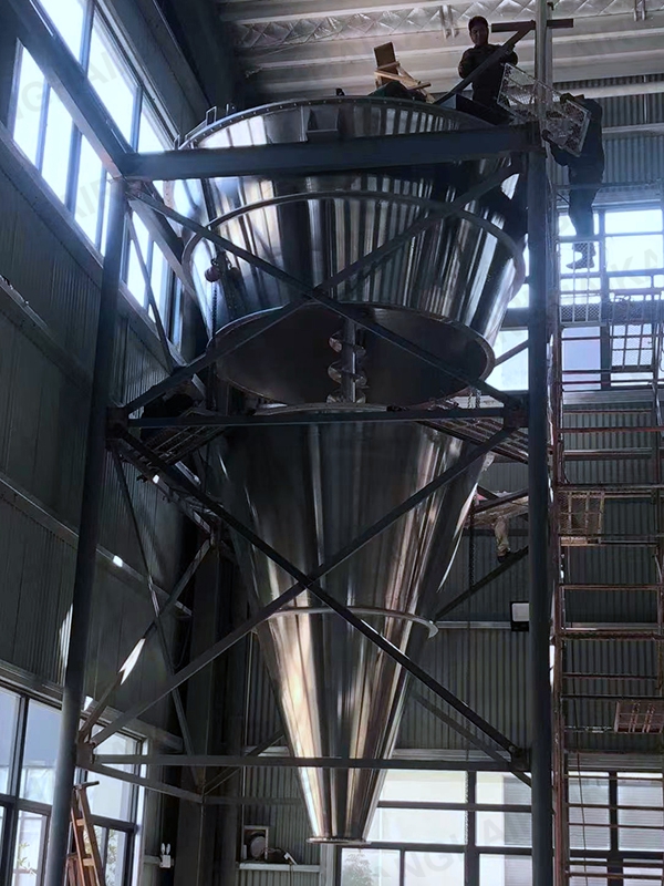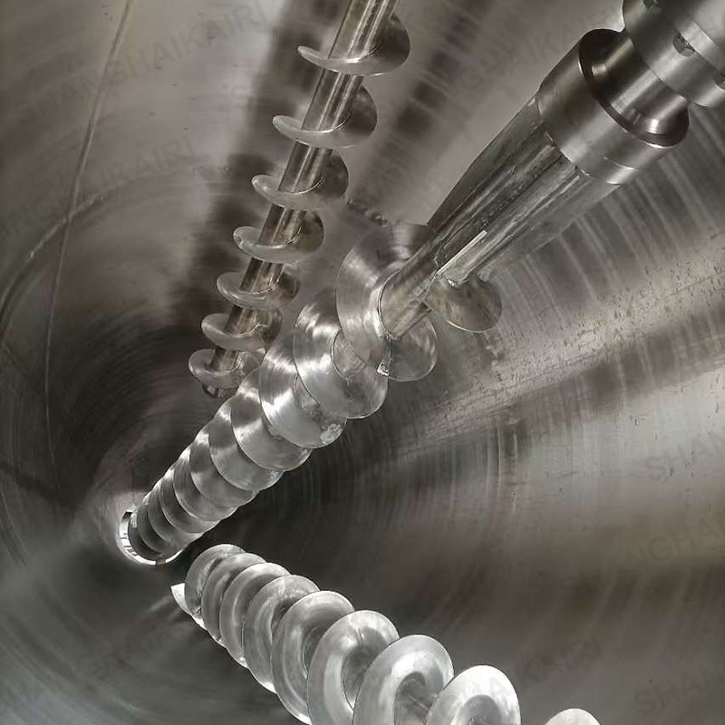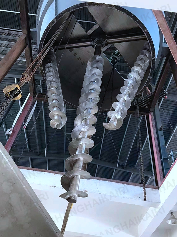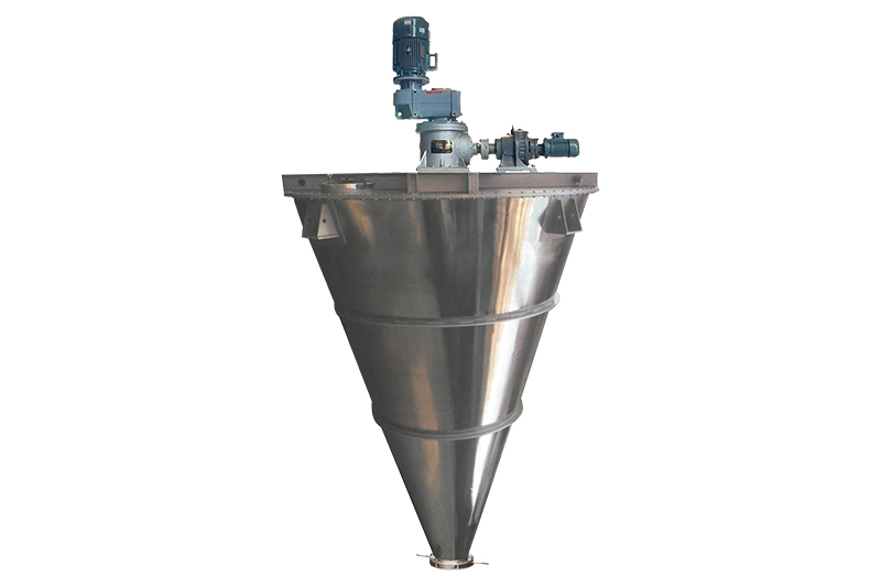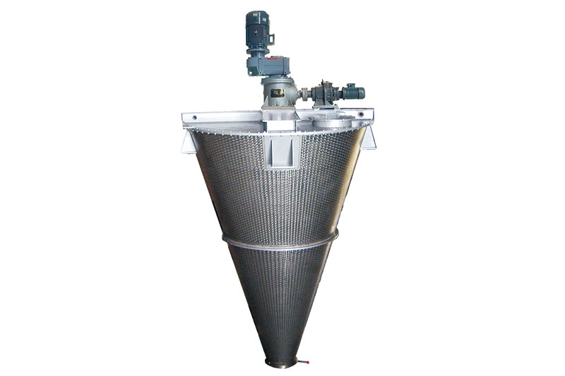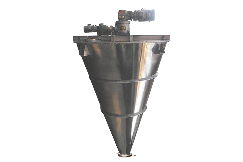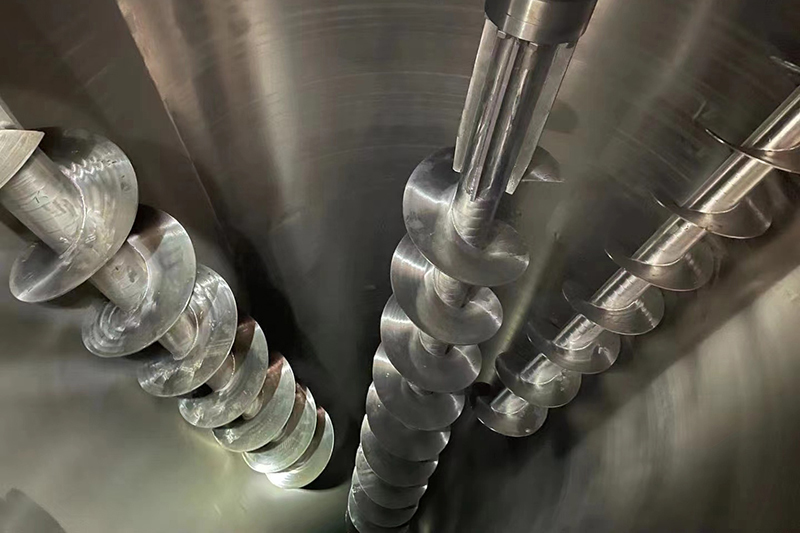 混合机三条螺旋(二条对称排列螺旋及中间一条长螺旋)的快速自转,将物料向上提升,形成三股沿筒壁自下向上的螺柱形物料流,长螺旋运转解决了中间物料混合的盲区及底部死角,