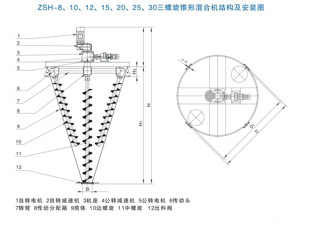 注:创新改进型ZSH三螺旋锥形混合机:2、3、4、5、6(m³)可按用户要求定制,有关尺寸以双螺旋尺寸为准。