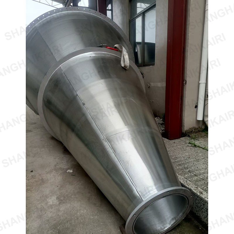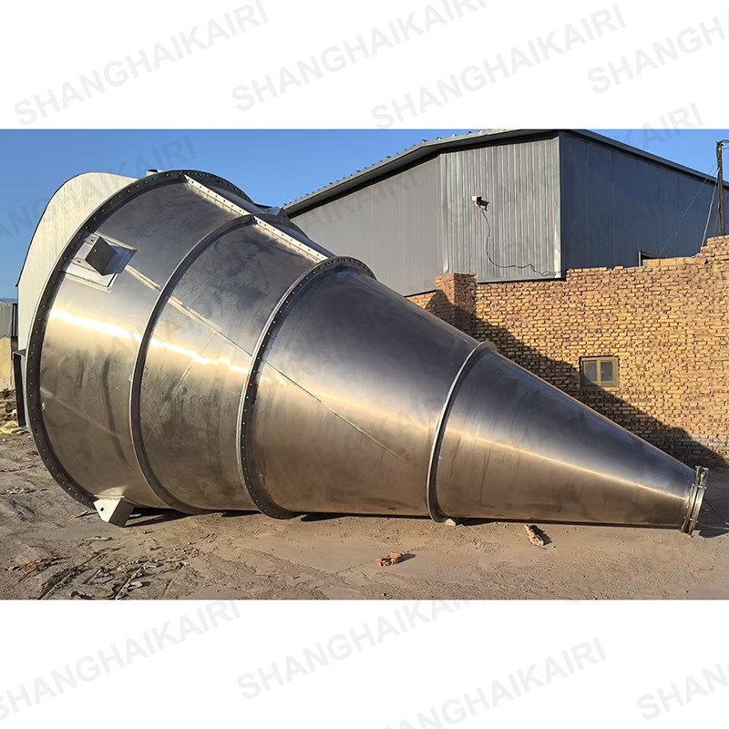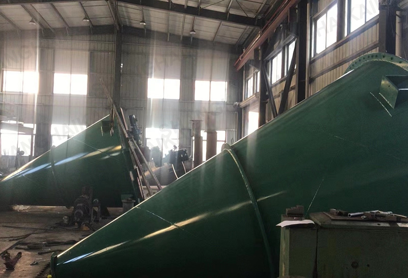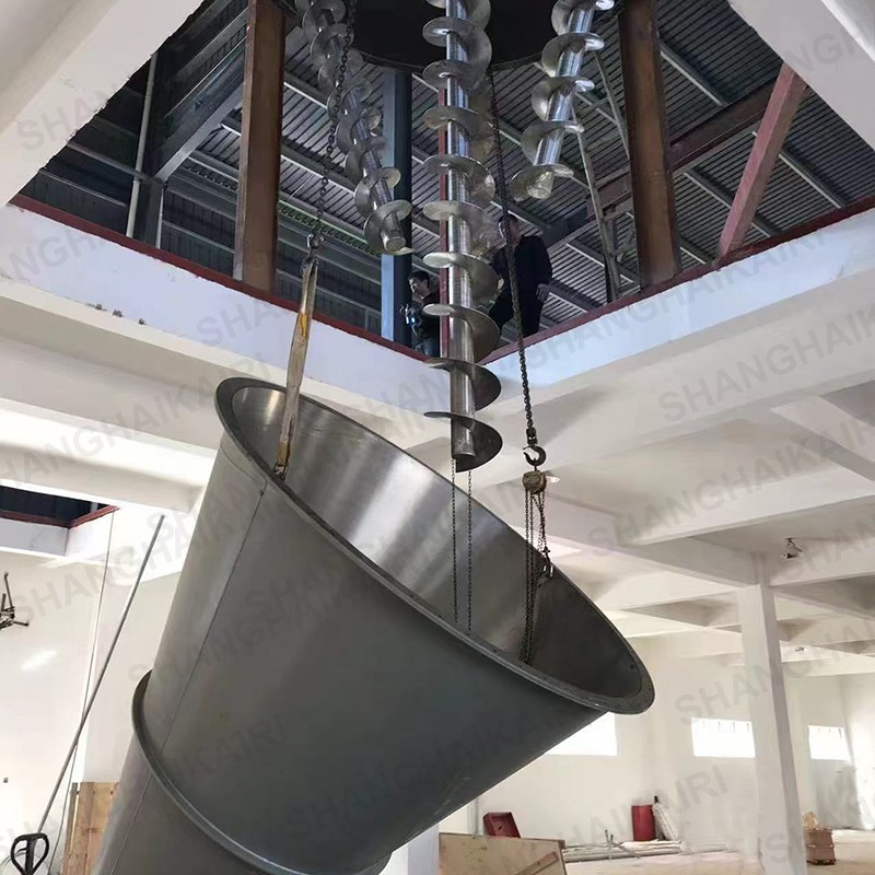锥形三螺旋混合机(8m³以上):在原双螺旋锥形混合机基础上系统进行创新改进,增加一条螺旋,采用两条对称排列螺旋及中间一条长螺旋(叶片加大)运转,原长螺旋斜度大、压力大、今缩短螺旋长度牢固,增加螺旋的强度,使得三条螺旋比现有的双螺旋运行更加的稳定,螺旋越多,混合效果越明显,解决了中间物料搅拌的盲区及死角,底部物料不断往上提升,混合精度更高,提高生产率,保证质量,使设备寿命增长。采用该系列机提升混合效果,解决了用户对特轻、特细等物料难以混合均匀的困难,对密度大等物料更加适用,同时对一般物料速度、精度均有明显提高,减少混合时间,具有节能意义。