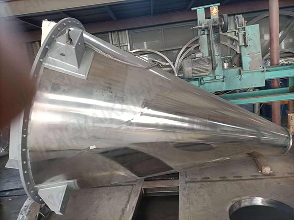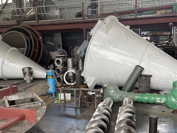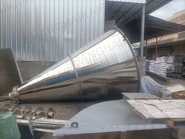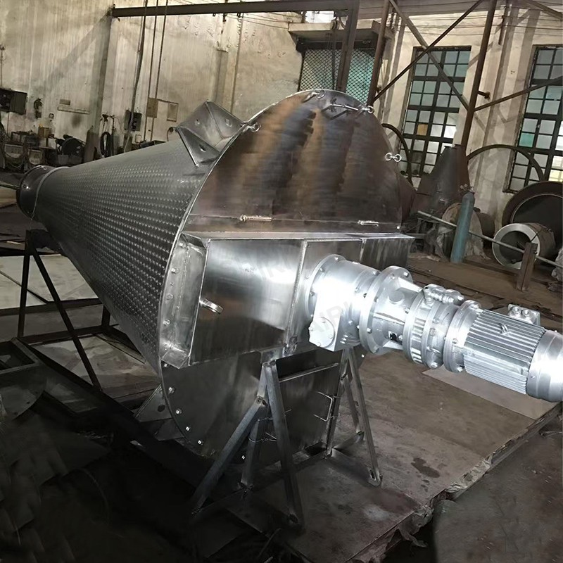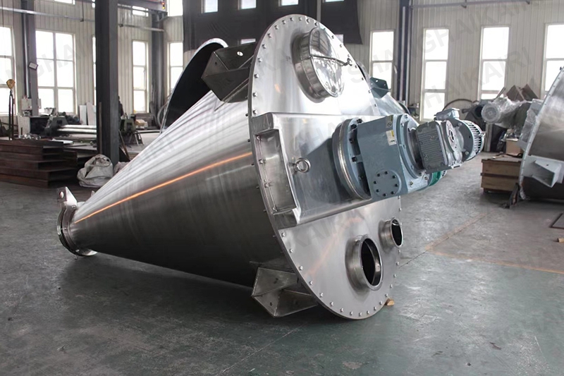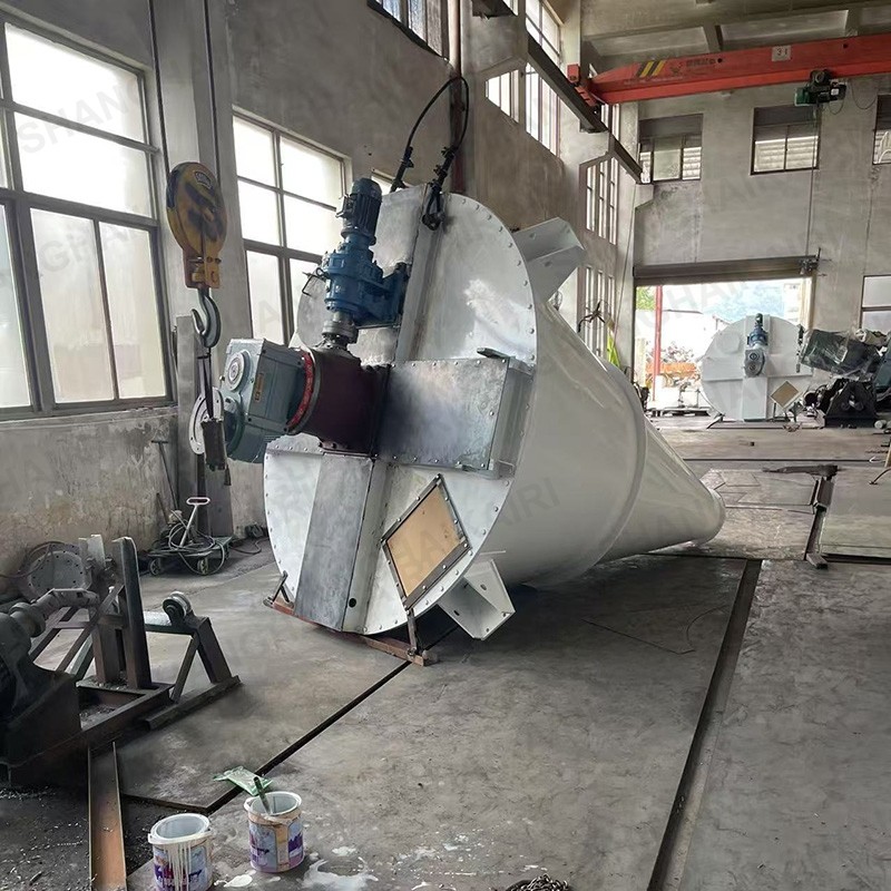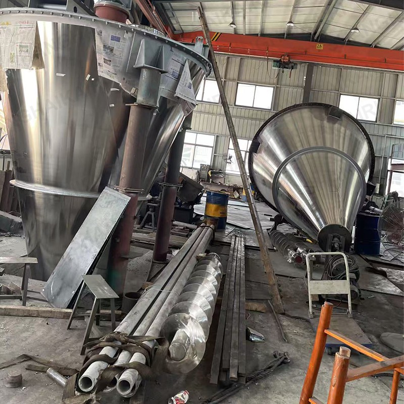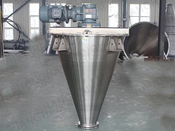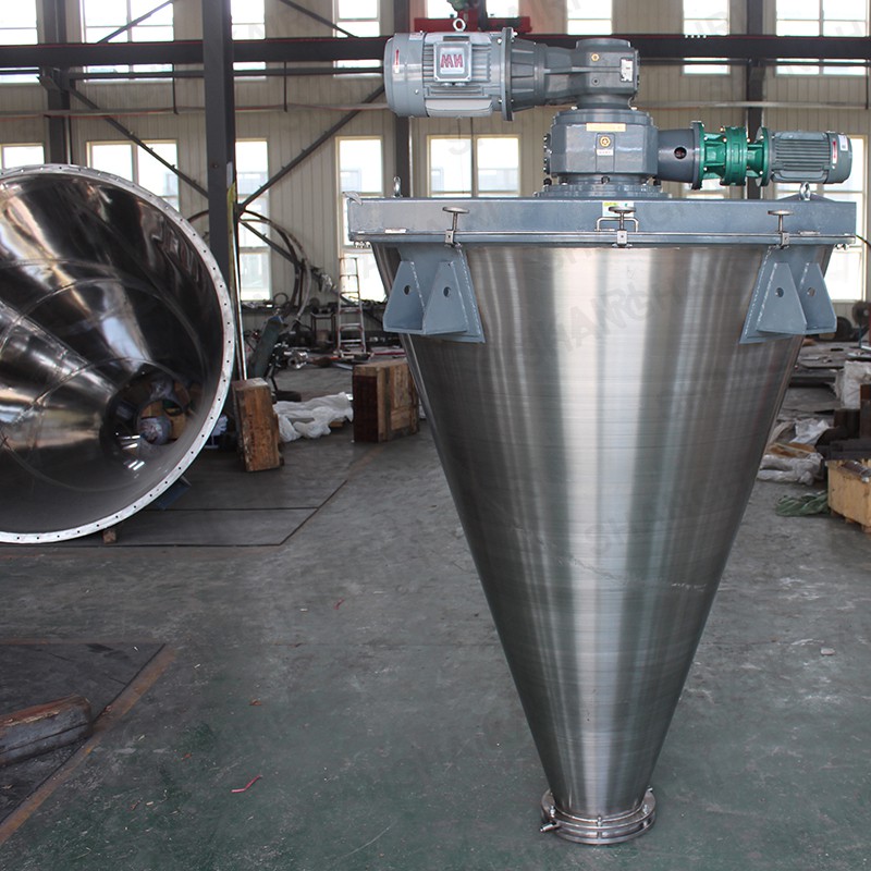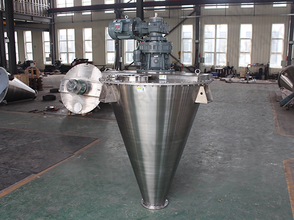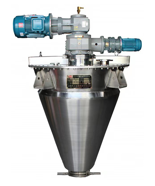 ZSH型双螺旋锥形混合机的搅拌部件为两条不对称长短螺旋;二条螺旋在绕自己的轴线自转转动的同时,还借助悬臂的转动,环绕锥形容器的中心轴,沿锥形容器的内壁做行星公转运动;本设备通过螺旋的自转、转臂带动的公转使物料反复提升,在锥体内产生剪切、对流、扩散等复合运动,短时间内达到混合均匀、精度高。该机的优点是应用范围广、适应性强、容积大、出料无残留、效率高、节能。
