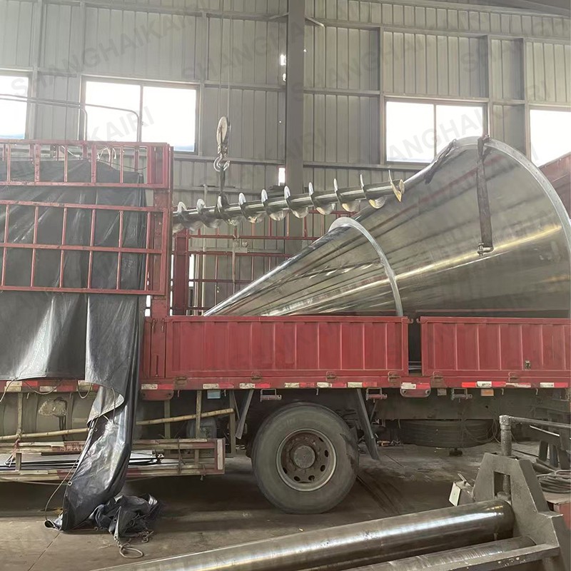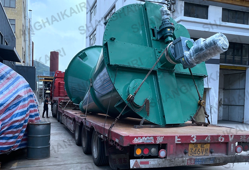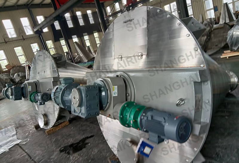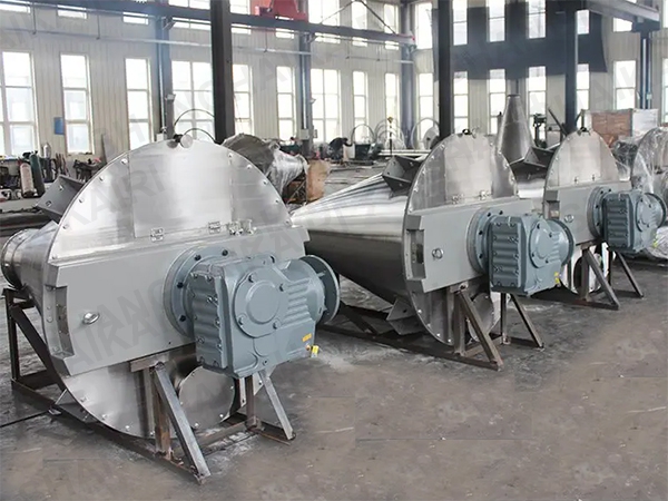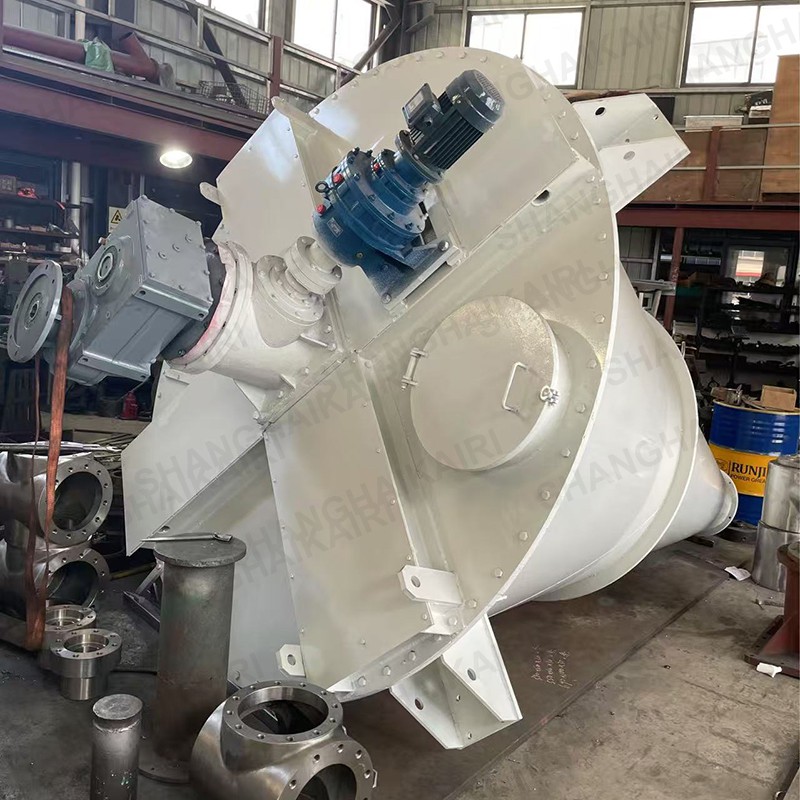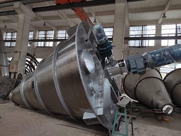 混合机二条非对称长短螺旋的快速自转,将物料向上提升,形成二股沿筒壁自下向上的螺柱形物料流。