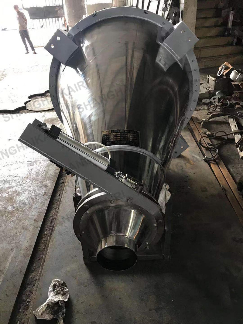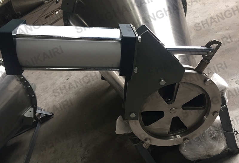 混合机出厂时均配有梅花型转盘式错位阀,可控制放出料速度。大开门出料阀可快速的将物料从筒体内排出,按用户要求该机也可装配蝶阀、闸阀、球阀等国标阀门。出料阀的操作方式,手动用S、电动用J、气动用Q。