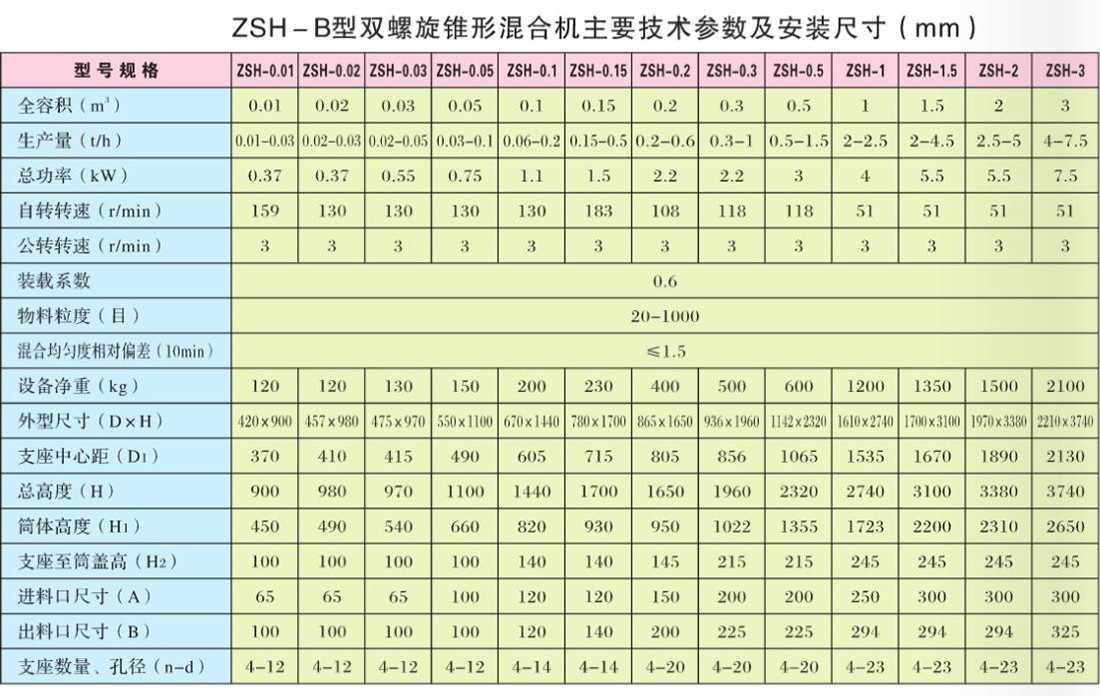 该新一代ZSH系列双螺旋锥形混合机是历年来采纳广大用户的宝贵意见和建议,针对混合工艺要求,结合实际需求,在原机型基础上,减速等系统进行全新改造,采用二台减速机传动(自转装置由先进新一代齿轮减速机代替老式摆线针轮减速机,使设备噪音降低,寿命增长,不易发热、漏油等),独特混合结构,设计新颖、能耗低,其可靠性、稳定性、适应性广等性能上是高配置,提高了混合使用范围和高效率等显著优点及设备使用寿命长,创新优势,曾获得国家多项专利,专项制造,配备电器控制箱,运行更安全。