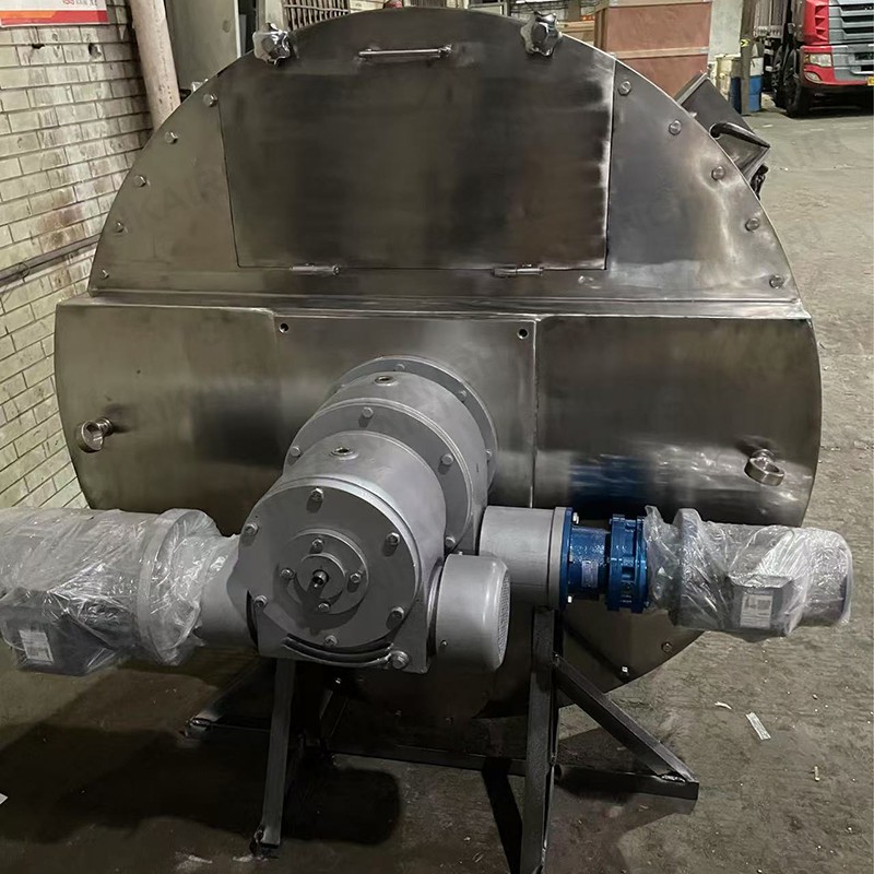 该机混合型式先进、造型美观、结构设计合理、比其他类型混合速度快,混合物料精度高,动力消耗低,装载系数大,使用寿命长,操作条件良好,清理、维护方便。该机筒盖部分可掀起打开,清洗方便;独立设计,创新大开门卸料结构,出料迅速,无残留,解决了以往转盘式(老式)出料不通畅,阻挡夹带物料,残留量多、不易清洗和拆装等缺点。本系列混合机集国内外同类产品之优点,并设计带有喷液装置,设备工作时两根非对称螺旋按顺时针快速自转,将物料向上提升。同时又沿筒臂慢速公转,促使物料在机内流动,短时间内达到高精度混合。