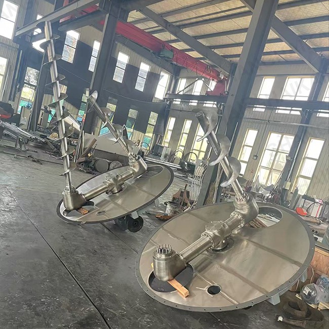 转臂带动螺杆的公转运动,使螺旋外的物料不同程度地进入螺柱包络线内,一部分物料不同被错位提升,另一部分物料又被抛出螺柱,从而达到全圆周方位物料的不断更新扩散,被提升到上部的二股物料,再向中心凹穴汇合二股物料汇合,并形成一股向下的物料流动,补充了底部物料空穴,从而形成对流循环的多重混合效果。