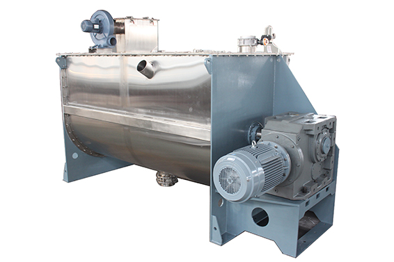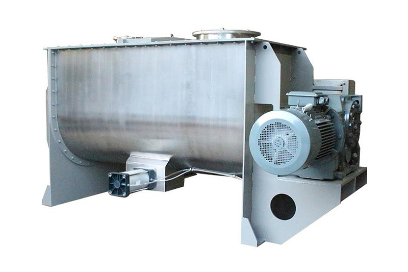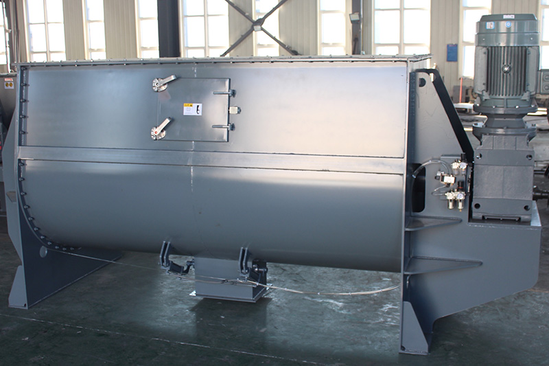 卧式螺带混合机混合部件有内外螺带,外螺旋带在动力的驱动下,其螺旋机构配合旋转方向把物料从筒体两端向中央地带推动,而内螺旋带把物料从中间向两端推动,形成对流混合。混合机卧式筒体底部出料口,外螺带的螺旋结构配合主轴旋转方向推动筒壁内侧物料至出料口出料。